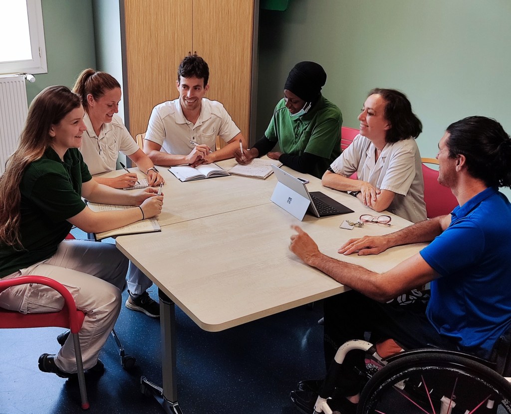 En effet, infirmier de formation et sportif de haut niveau multi-médaillé, il a été notre partenaire dans la mise en place de sessions d’initiation à l’escrime handisport avec le club du Val d’Europe. Avec l’équipe d’EAPA (Enseignant en Activités Physiques Adaptées), Il a également animé des sessions de basket fauteuil, ou encore organisé des sorties découverte du quadrix avec des patients du CMPR.